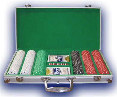 velour with space for 300 chips, 2 decks of cards and 5 dice.
